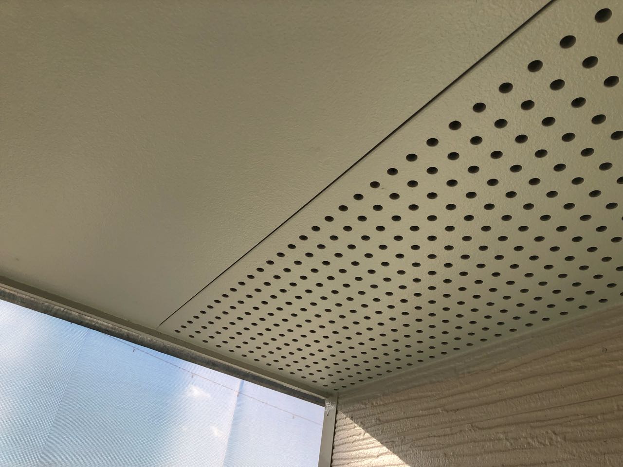 軒天の仕上げ塗装工事です。上裏(あげうら)とも表現します。外壁塗装とは異なり湿気の帯びやすいこの部分にはカビの生えにくい専用塗料で塗装します。塗料の粒子が細かく基材に浸透しやすいため高い吸着力があり目地や釘頭などを目立ちにくくする効果もあります。